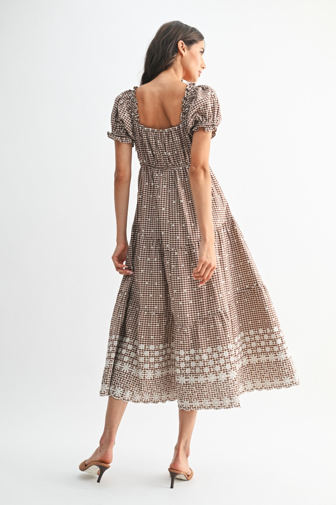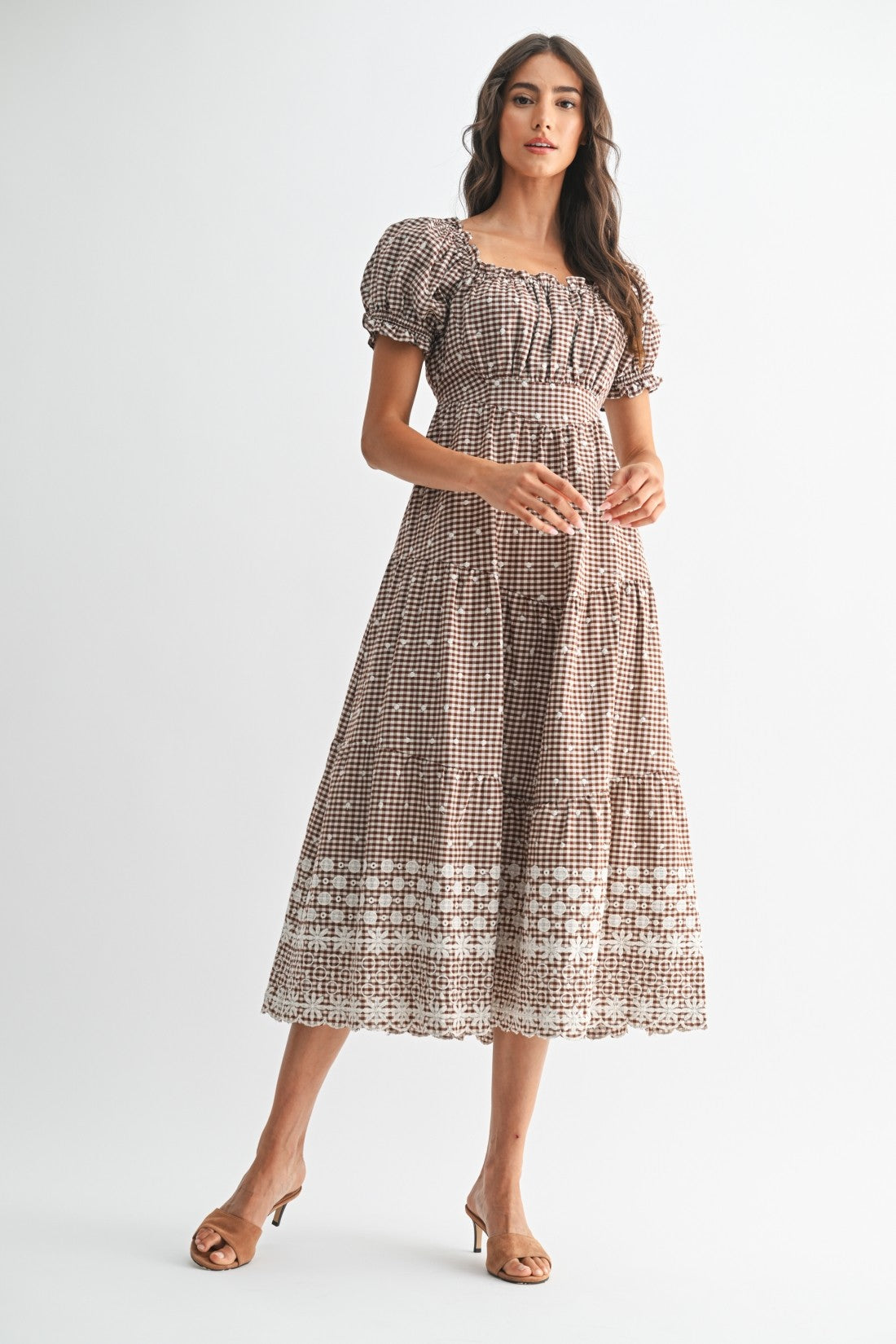 Brown/Ivory Gingham Short Puff Sleeve Midi Dress
