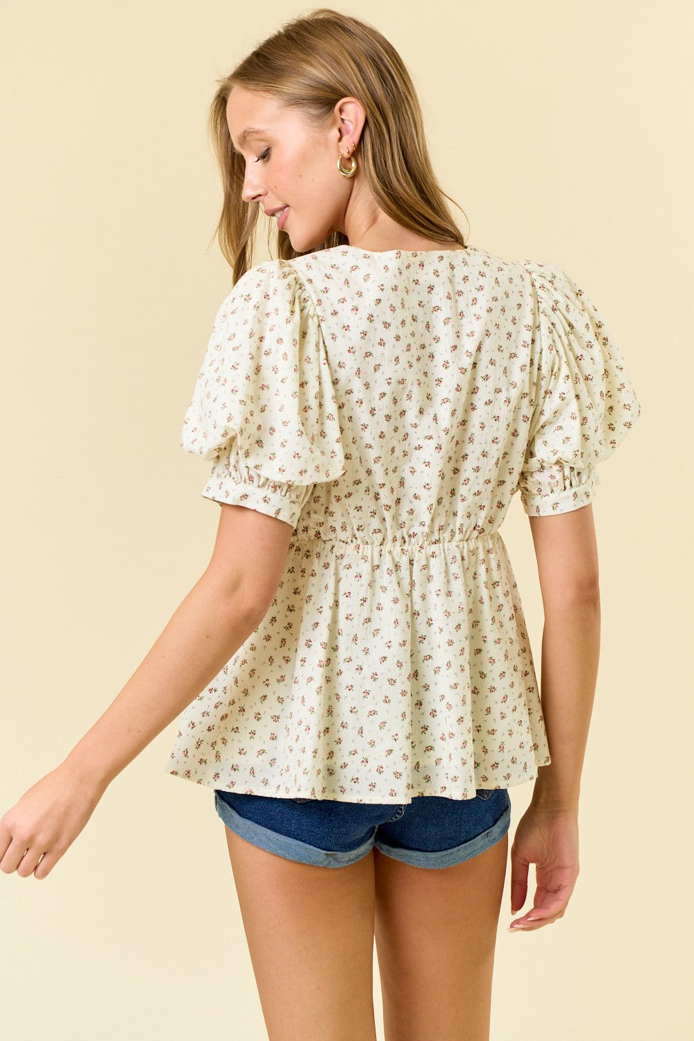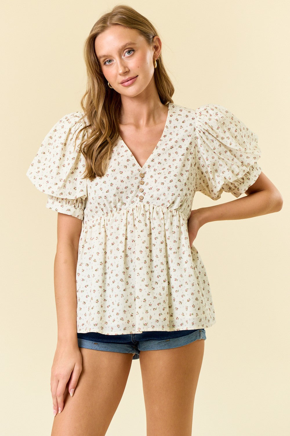 Ivory Floral Printed V-Neck Double Puff Sleeve Blouse