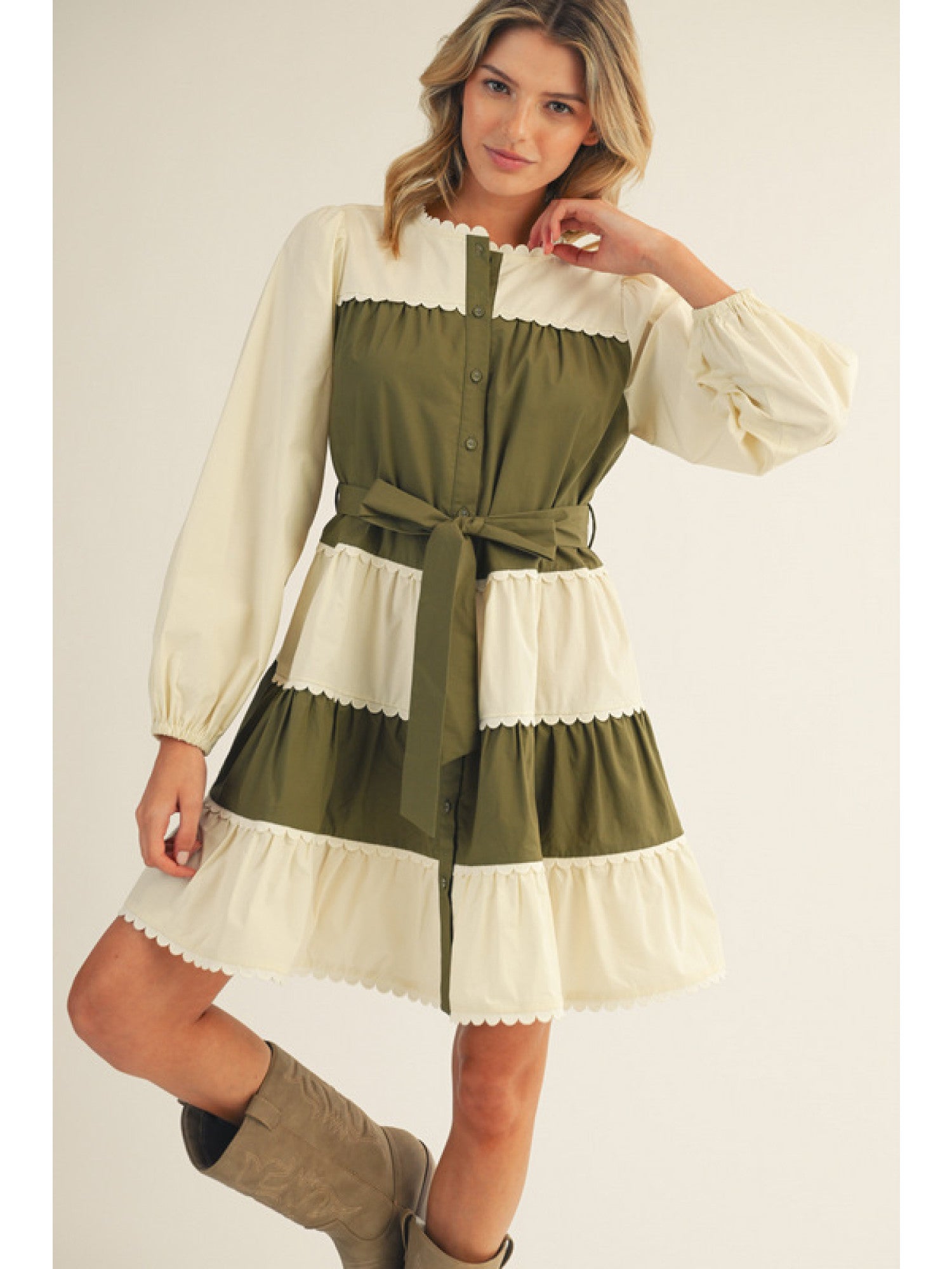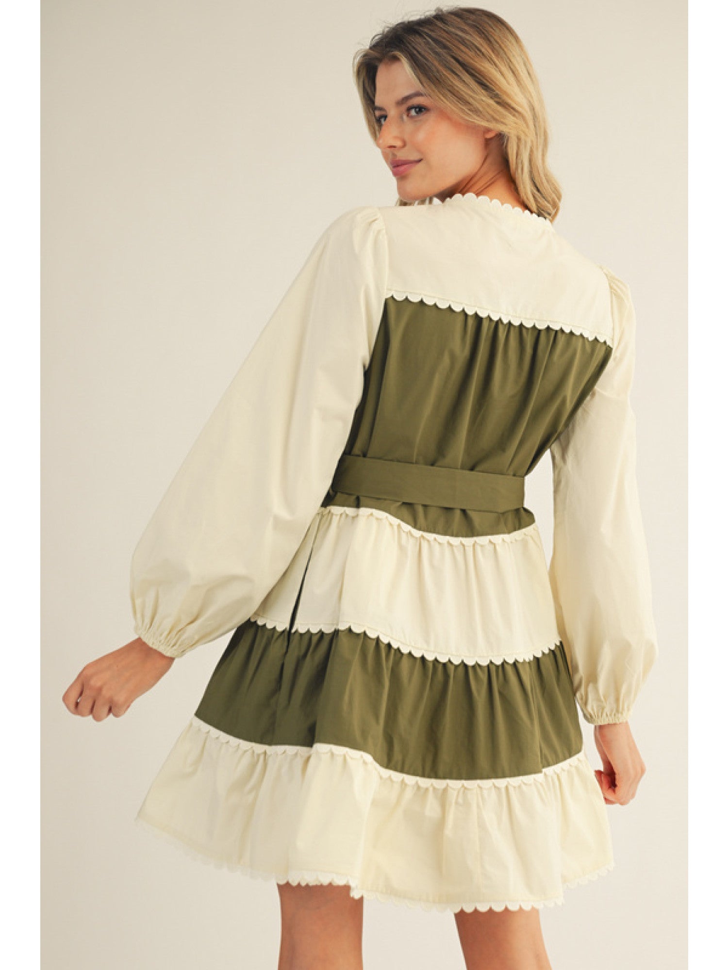 Olive/Cream Tiered Stripe Long Sleeve Mini Dress