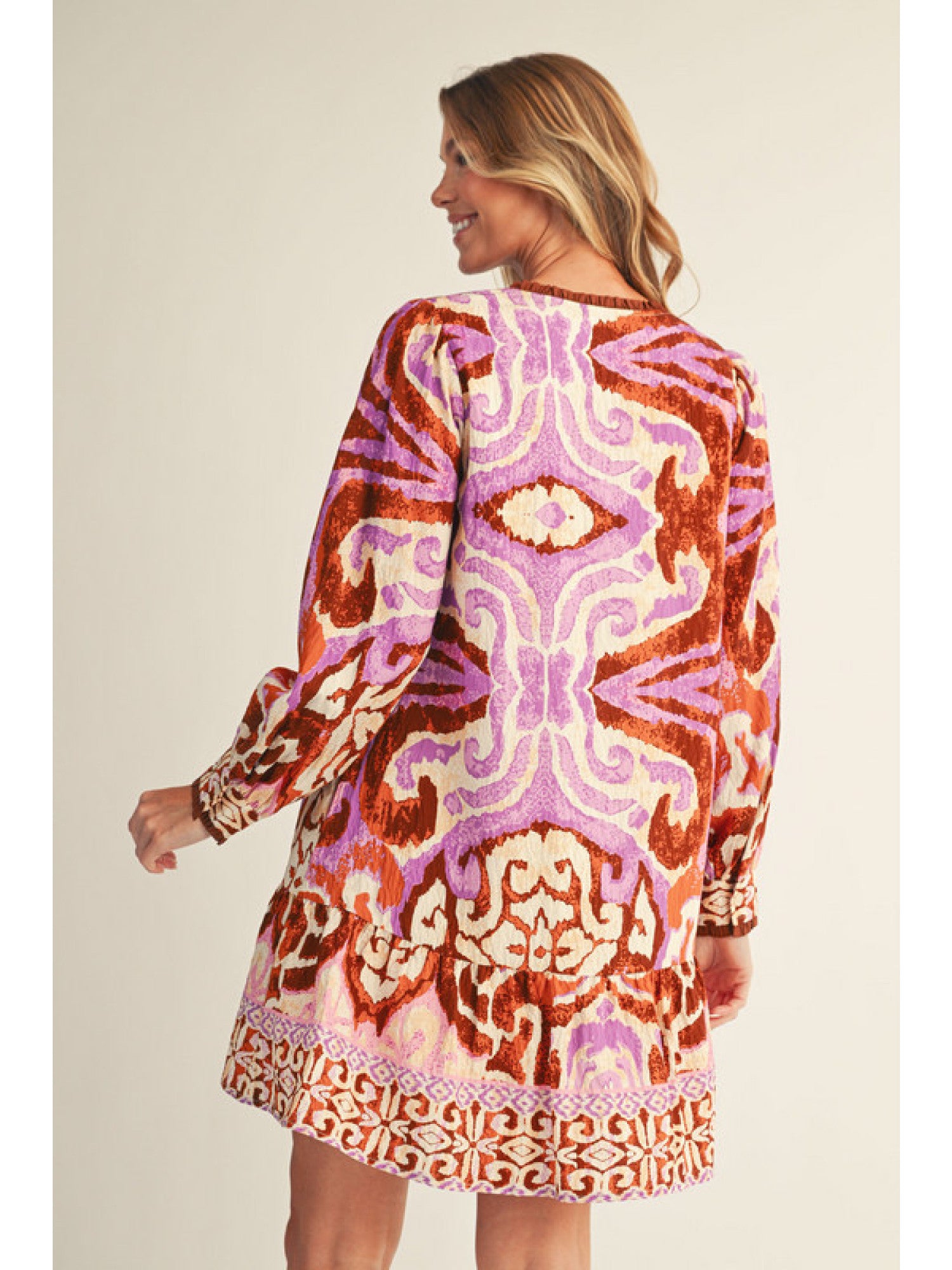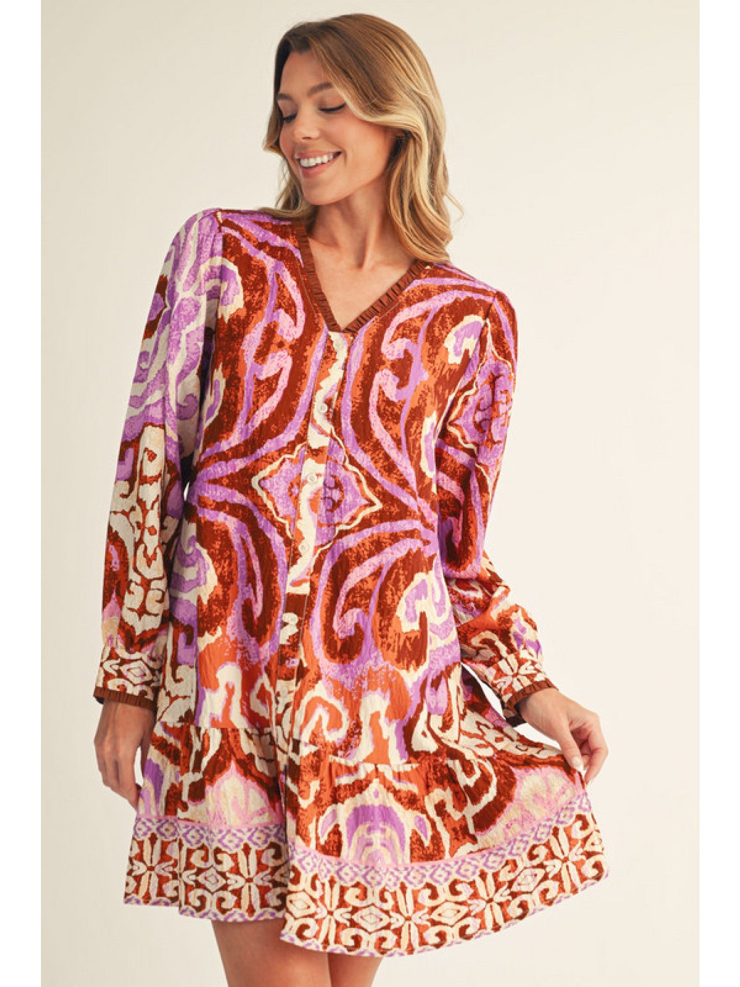 Toffee Abstract Printed Long Sleeve Button Down Mini Dress