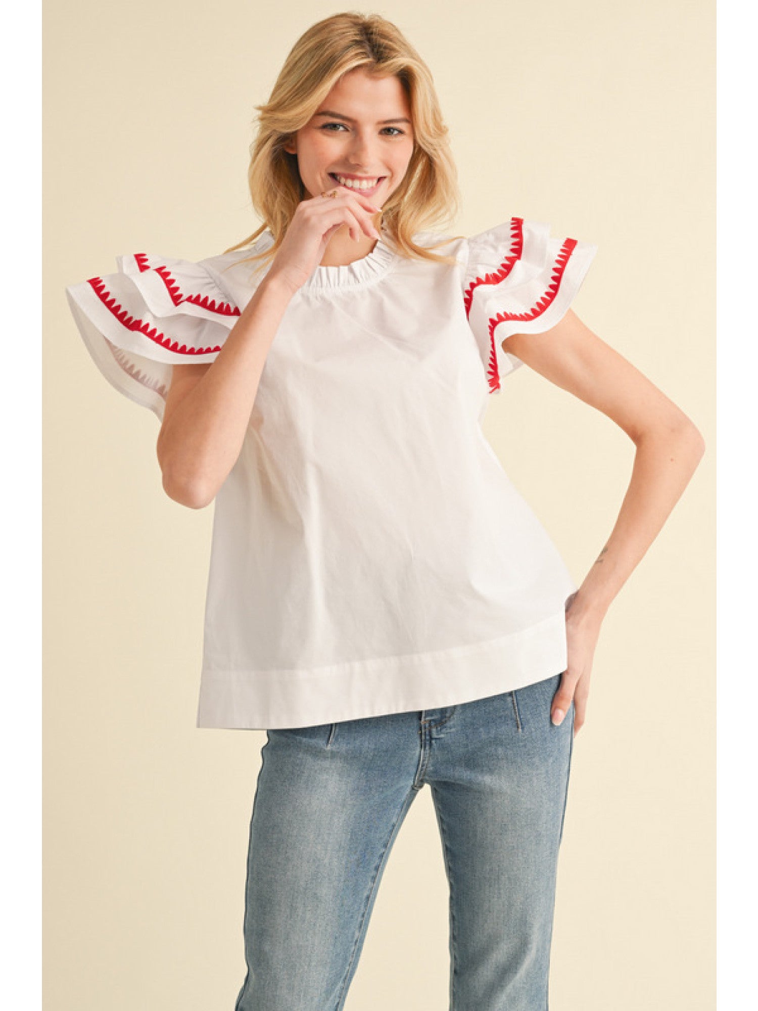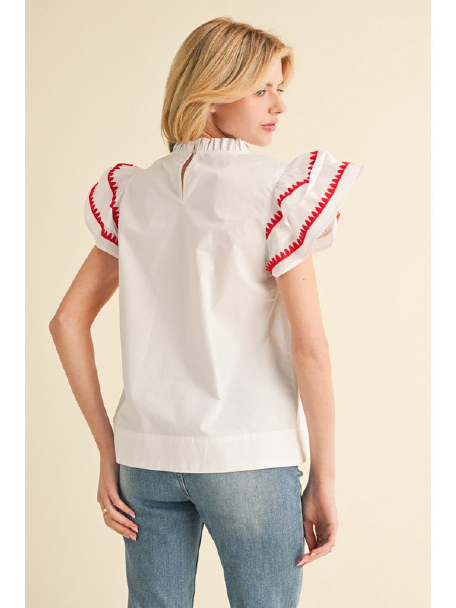 White High Neck Short Sleeve Blouse w/ Red Trim